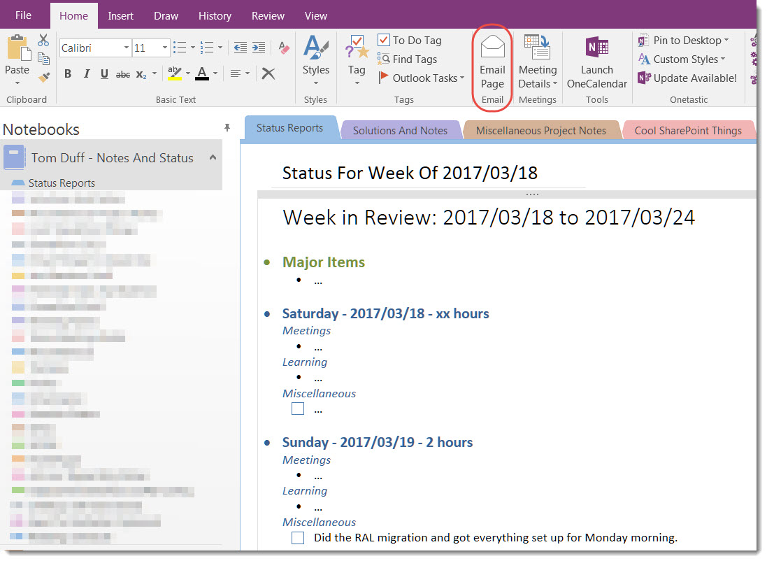 Once I have my status report filled out for the week, I simply click the Email Page button and get a new email that has all the OneNote content formatted the same as my OneNote page:
