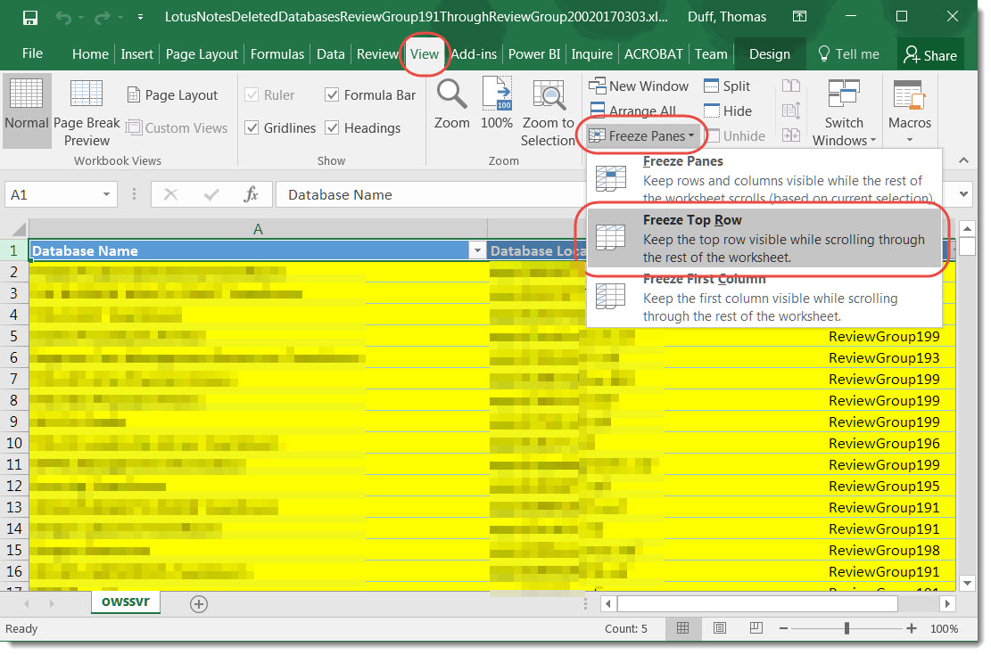 OK… this is one of those stupid things I probably should already have known, but I finally decided to look up how to do it. You know how sometimes when you’re in an Excel spreadsheet, you can scroll up and down the rows, but the first row of Header columns stays fixed? Here’s how you do that…