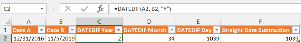 Here’s a spreadsheet that has two dates in cells A2 and B2. Using the DATEDIF function, we get the year difference (cell C2), the month difference (cell D2), and day difference (cell E2):