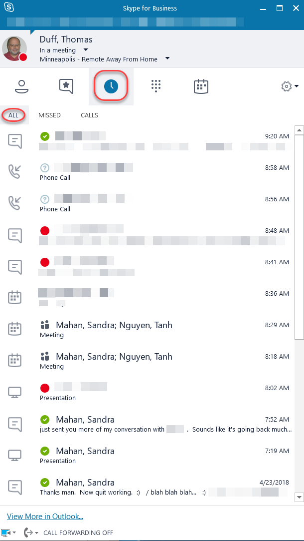 You will see all the conversations and calls you’ve been on. If you click on one of the entries, it will then open it back up in Skype instead of you having to go find it in Conversation History in Outlook: