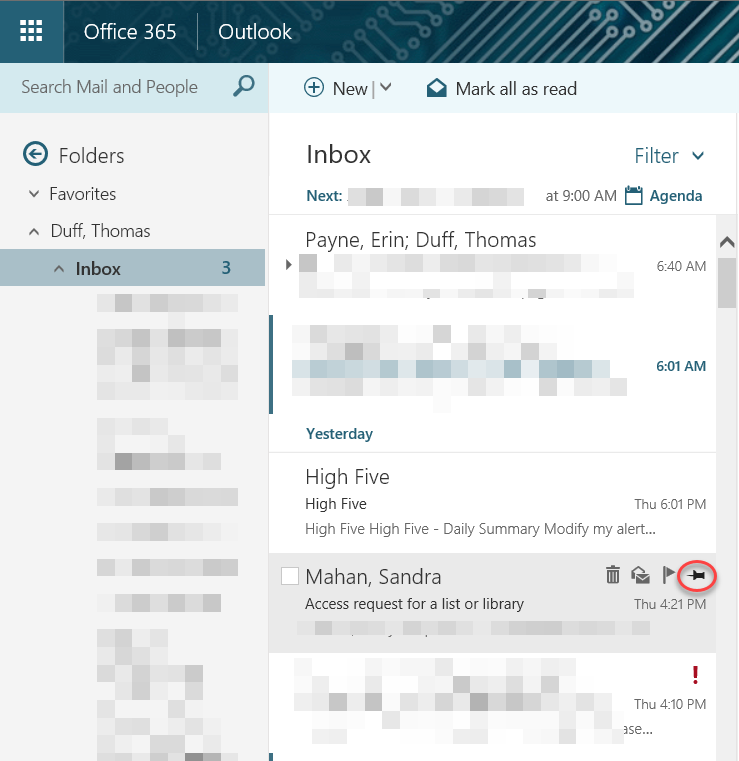 When you’re in Office 365 and using Outlook, you can hover over an email message (that’s the grey message from Sandra). There are four icons that appear, and the last one (the push pin) will pin your message in your Inbox. If the push pin is sideways, it’s unpinned. But when you click on the push pin, it’ll change direction: