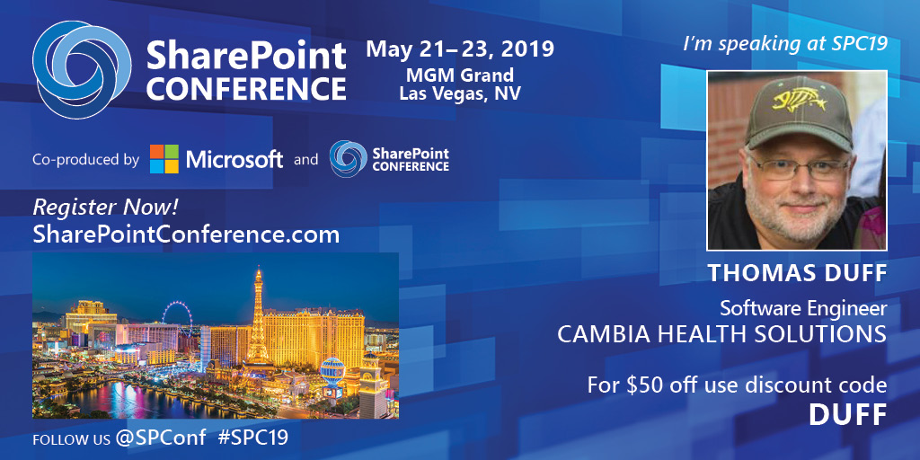 Can’t wait to present at my first SharePoint Conference May 21-23, 2019. Register with this link and get $50 off your registration fee… @SPConf #SPC19 https://www.sharepointna.com/#!/register?utm_term=DUFF