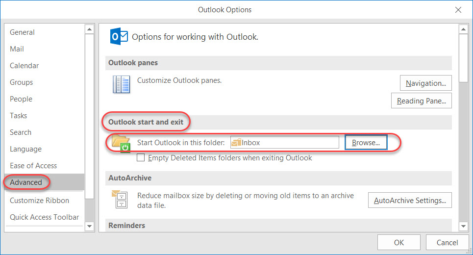 By default, it’s set to Inbox. However, if you click Browse, you’ll see a list of all the folders you have, including your Tasks and your Calendar. Select a different folder and click OK, and Outlook will start in that folder next time you launch it: