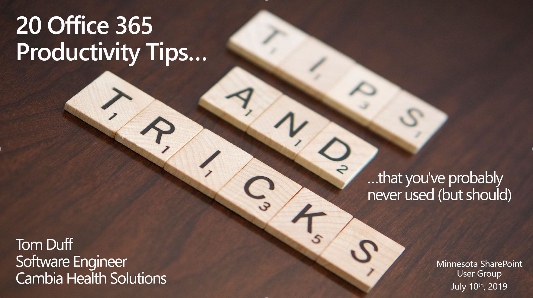 My slides from the Minnesota SharePoint User Group presentation on Office 365 Productivity Tips oneminuteofficemagicJuly 10, 2019Excel, Microsoft Stream, Microsoft Teams, Mobile Applications, Office 365, OneNote, Outlook, PowerPoint, Word Post navigation PreviousNext 20 Office 365 productivity tips that you’ve probably never used but should SharePointMN 201907 Share this: Click to share on X (Opens in new window) X Click to share on Facebook (Opens in new window) Facebook Like Loading...