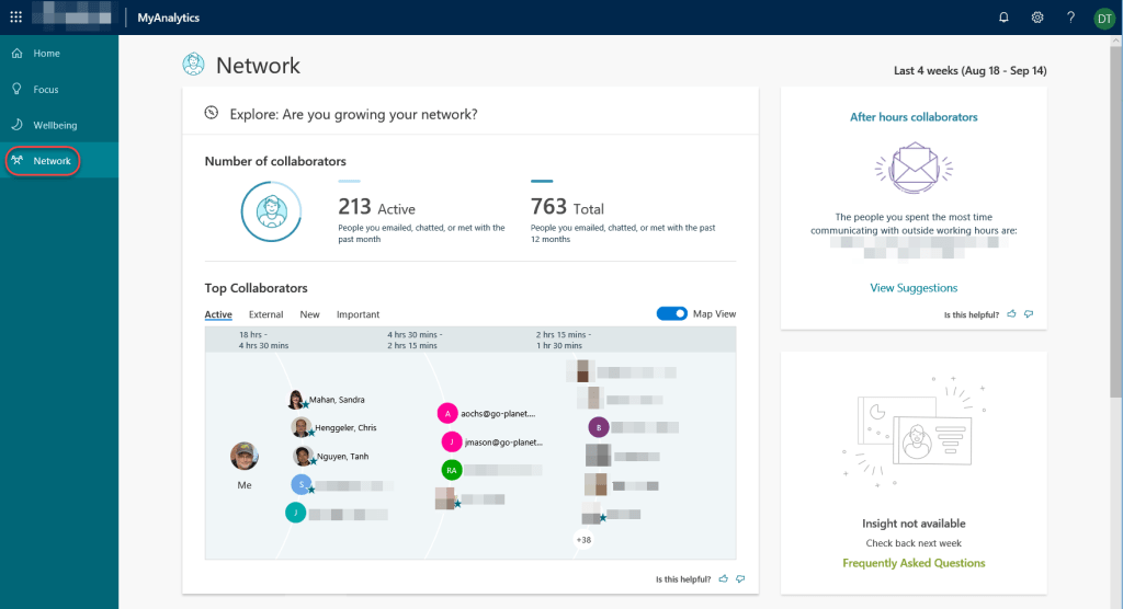 Finally, your Network Analytics show the number of people you collaborate with, who are the top people you interact with outside of normal work hours, and who you spend the most time with: