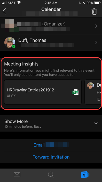 Here’s my Outlook calendar on my iOS phone. For this illustration, I’m going to focus on my 1:15 pm meeting with HR:
