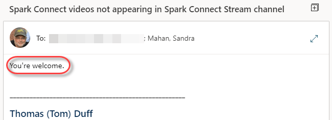 In this case, I chose “You’re welcome”, clicked the button, and a Reply to All email was generated with that as the text: