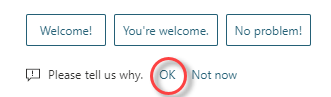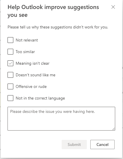 If you look back at the first image, you’ll also see where I have an opportunity to offer Microsoft feedback on the “suggested suggestions”, and whether they were helpful or not. If I click No, it gives me an opportunity to explain why if I click OK:
