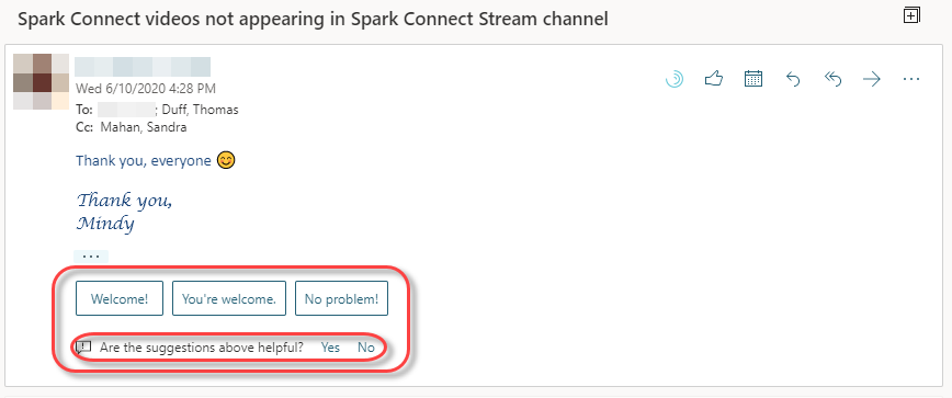 In this email using Outlook on the Web, I have three suggested replies that I can use with a single click:
