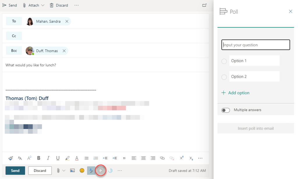 Now when you create a new email, you’ll see the Quick Poll icon in the toolbar. Click that icon, and you’ll see the Poll panel to fill in the name of the poll, the options in the poll, and whether multiple answers will be allowed: