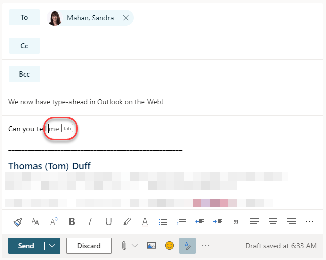 If you use a personal email client like Gmail, you’re probably used to seeing suggested wording appear as you’re typing away. Now Outlook on the Web has the same type-ahead suggestion feature! Here’s what it looks like…