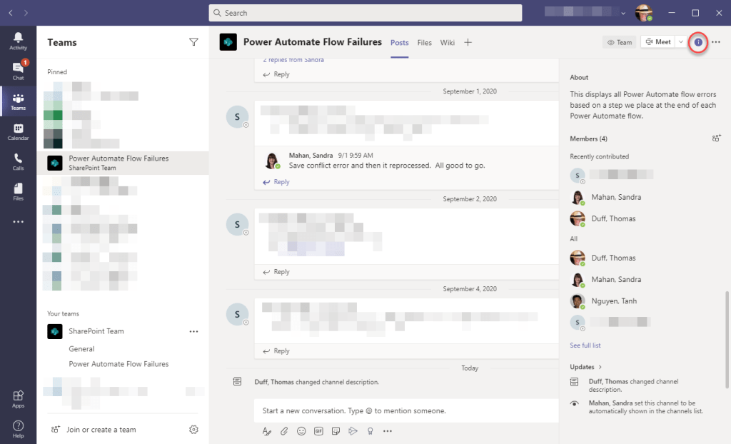 When you’re in a Channel, you should click on the Information icon in the upper right corner. That will display the About section, the Members (both all members and those who have recently contributed), and the latest updates: