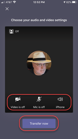 Before it joins me to the meeting, it gives me the chance to set video and microphone options. Once I set everything the way I want it, I click Transfer now: