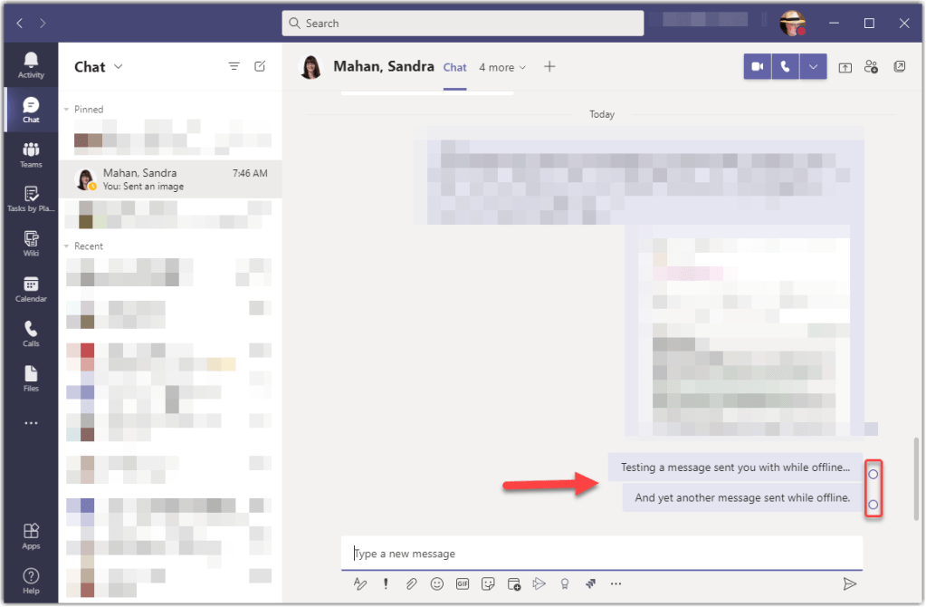 Once I reconnect to the network, Teams will go ahead and send them out, indicated by the round circles with a checkmark in them… no error messages!