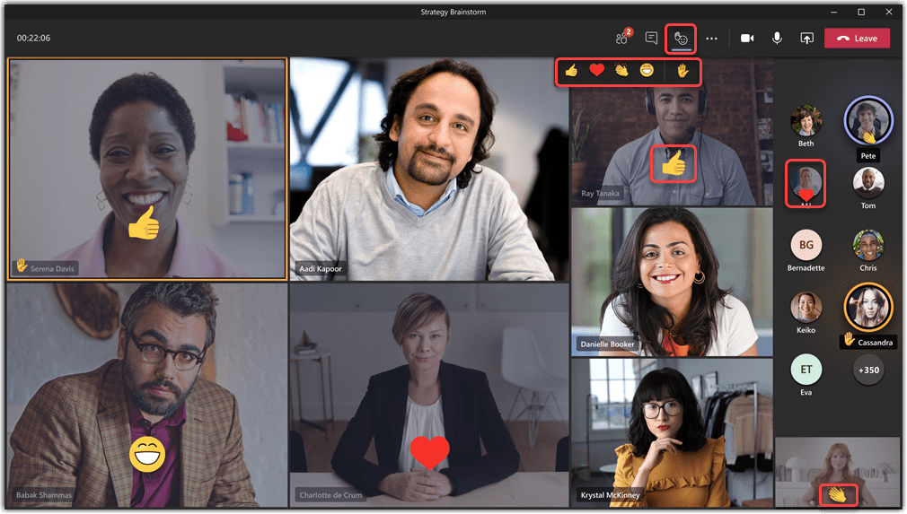 And if you’re watching a presentation without all the meeting attendee images, you’ll see the emoticons float up from the bottom of the screen as they are clicked by others:
