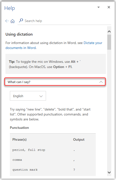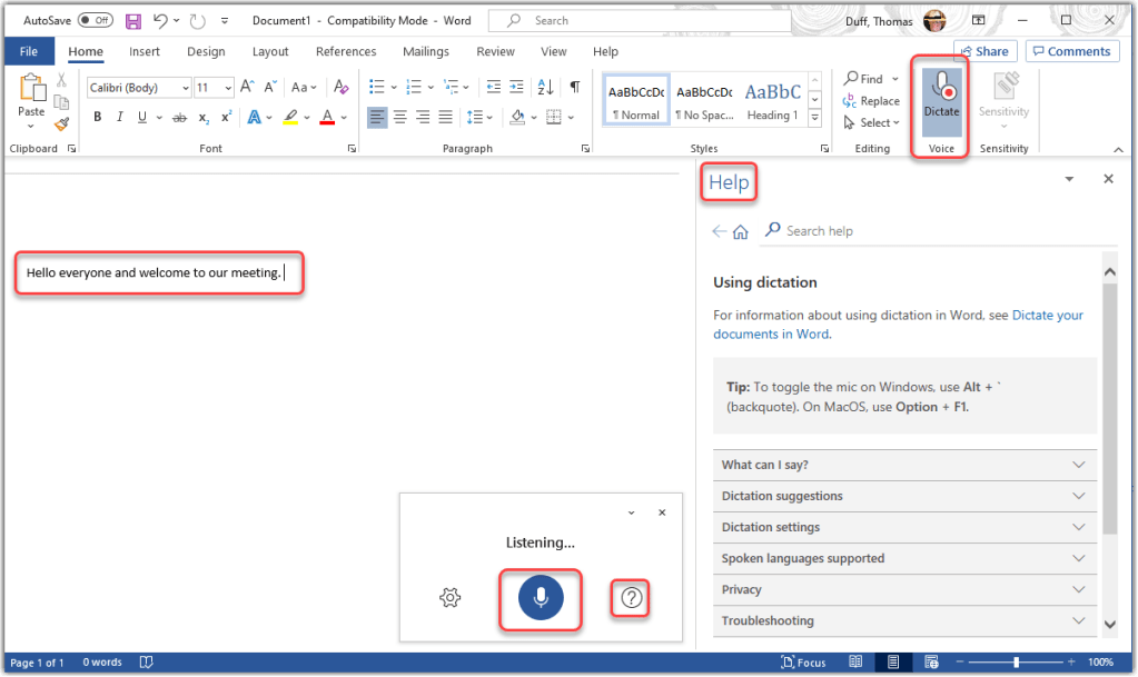 When the Listening panel appears, you can start talking into your microphone. The words you dictate will start to appear in your document. If you need help understanding the dictation feature, click on the question mark icon in the Listening panel. The Help panel will appear in the right-side of the document: