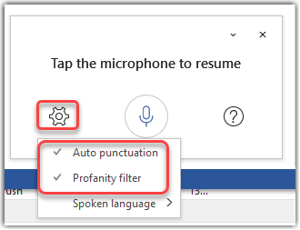 By clicking on the Gear icon in the Listening panel, you can turn on the Auto punctuation and Profanity filter features. The Auto punctuation feature will automatically add things like periods and commas, and the Profanity filter will use asterisks to remove any profanity:
