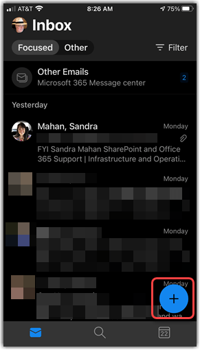 Here I have my Outlook Inbox on my iPhone mobile app. To send an email, I click on the Plus icon in the lower-right corner:
