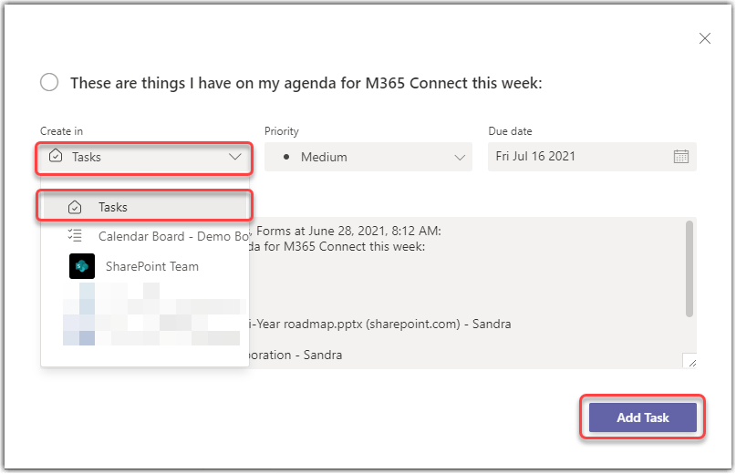 When I click on Create task, I get a task dialog screen that gives me the option to place it in Tasks (which is where I want it for my personal follow-up), set a priority and due date, and see the text of the chat message. Once it looks complete, I click on Add task: