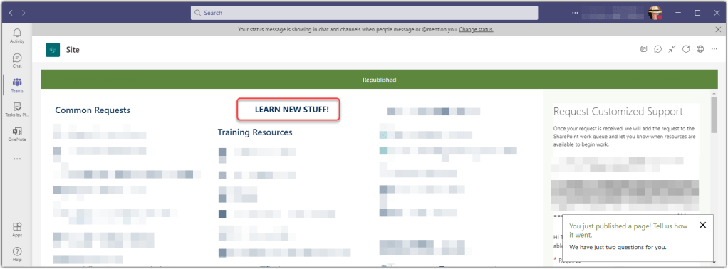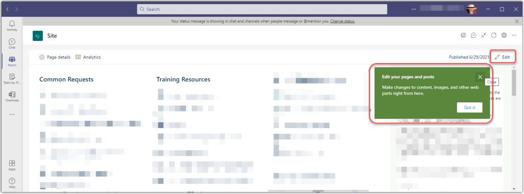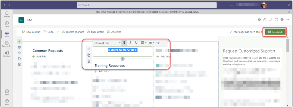 For more information, check out Edit a SharePoint page or news post in Microsoft Teams.