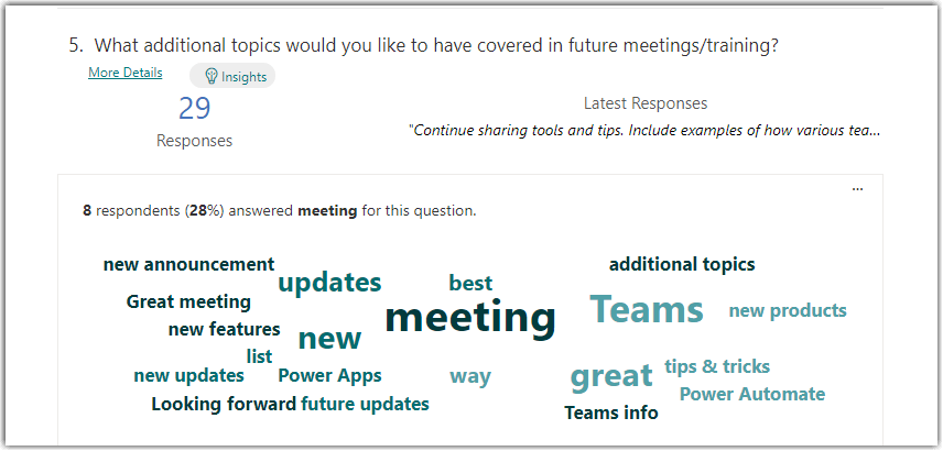 Microsoft Forms is a great tool for getting feedback on a various topic. However, if you’re using open text questions, you may find it difficult to get a quick read on basic trends and key words that are appearing in the responses. That’s a bit easier now using the Word Cloud Insights feature. Here’s how that works…