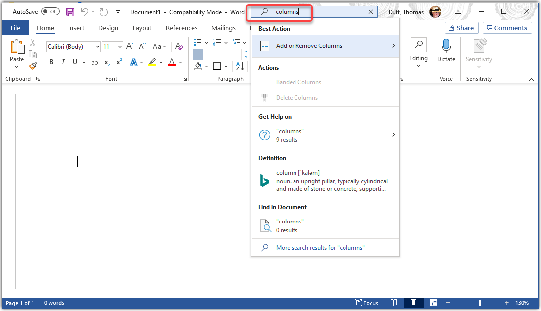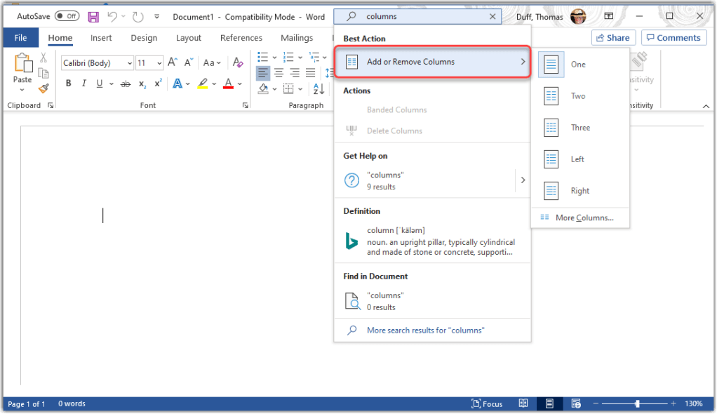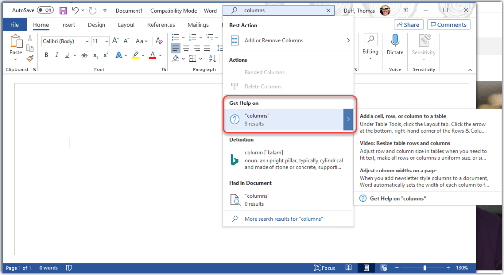 To use the Tell Me feature, just type in a word or phrase in the search box at the top of the screen. In this example, I’m searching for “columns” in Microsoft Word:
