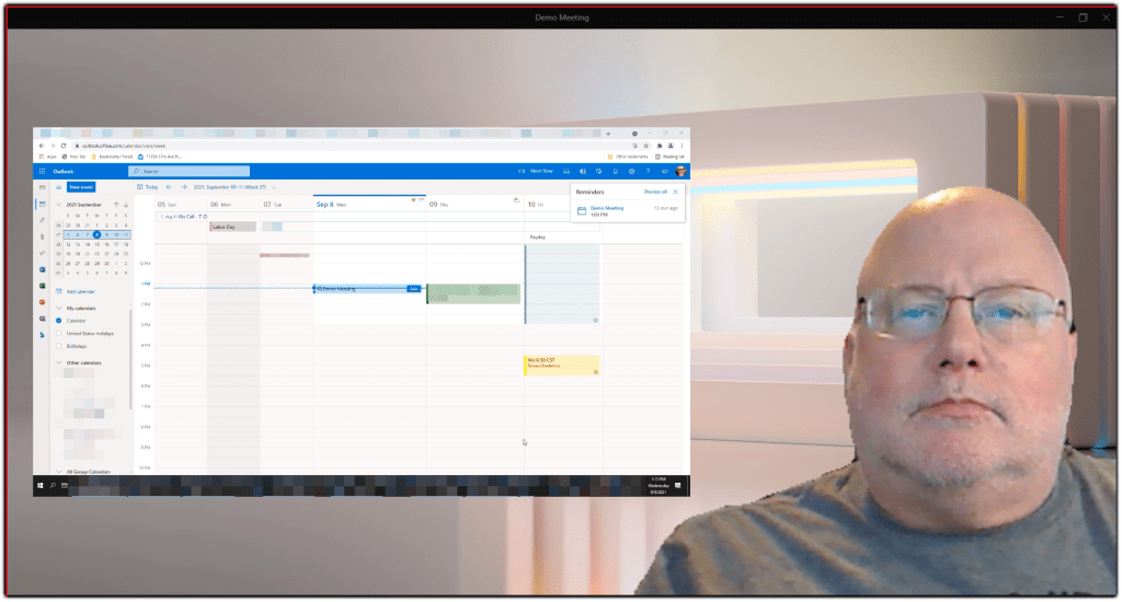 In Side-by-Side mode, my screen share is on the left and my video is on the right, with the video showing everything that the camera picks up in the field of vision:
