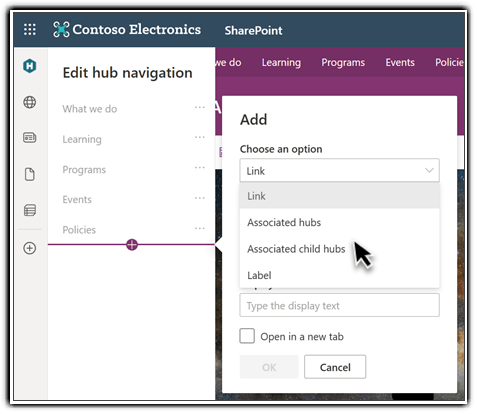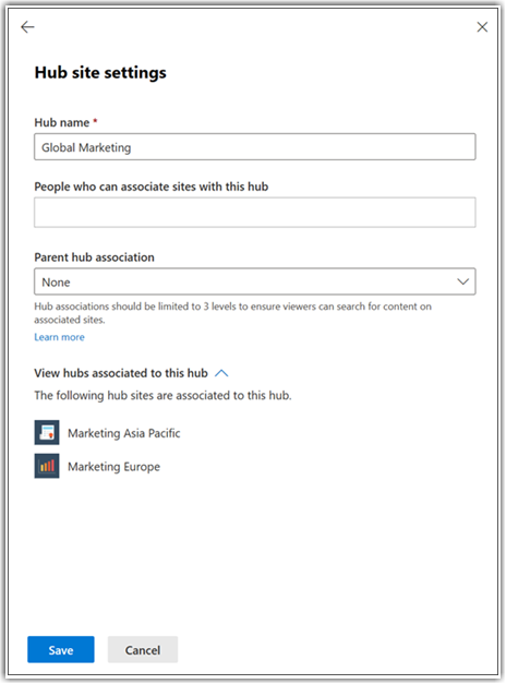 It’s also easy to add links to the associated hubs as well as any hubs that are associated with this hub site:
