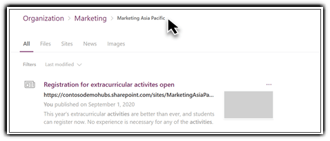 When you search, the search breadcrumb path at the top of the page displays the associated hub where the content is:
