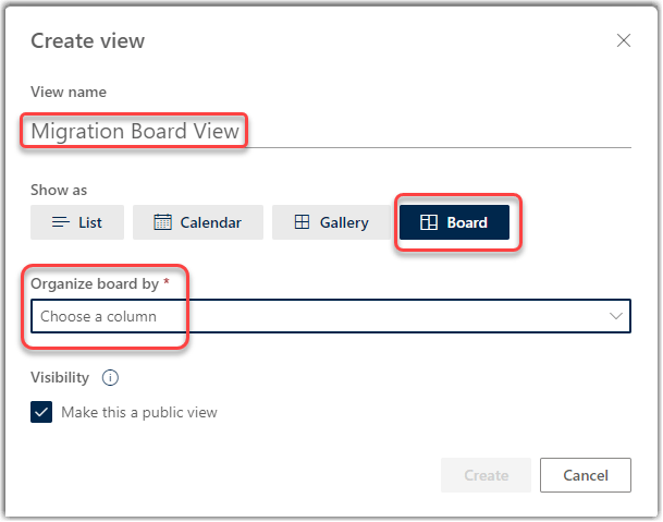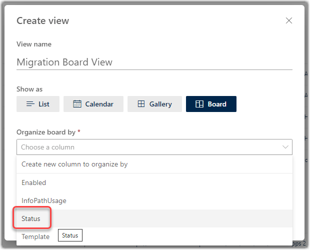 You also select the column you want to use for your “swim lanes”. This will create a separate lane for each value you have in that column. In this case, I select the Status column and then click Create:
