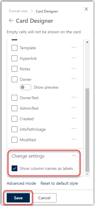 And at the very bottom, you have the option to have the card show the column name as the label above the column value: