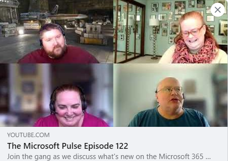 Episode 122 of the Microsoft 365 Pulse Roadmap webcast is now out on YouTube. Join Jennifer Mason, Tamara Bredemus, Adam Ochs, and myself as we cover this week’s updates.