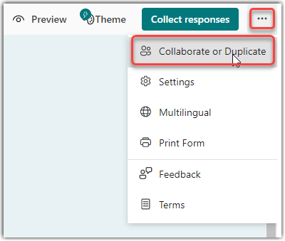 It’s less common to have people collaborate on a form you’re building out, so that option, Collaborate or Duplicate, is part of the Options ellipsis dropdown: