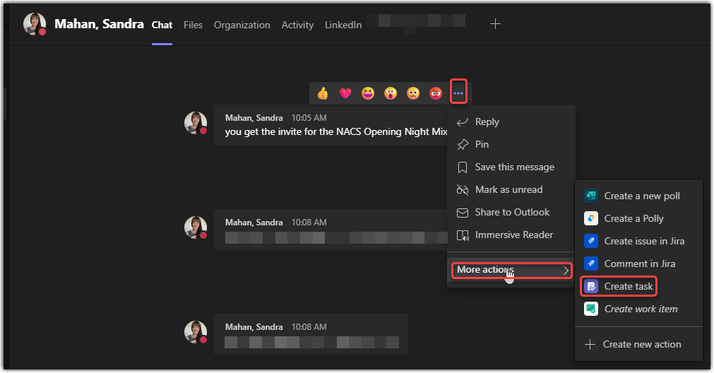 Here I have a chat with Sandra, and I want to make a task of the entry about a conference party invite. When I hover over that chat entry, I click on the ellipsis and select More actions > Create task: