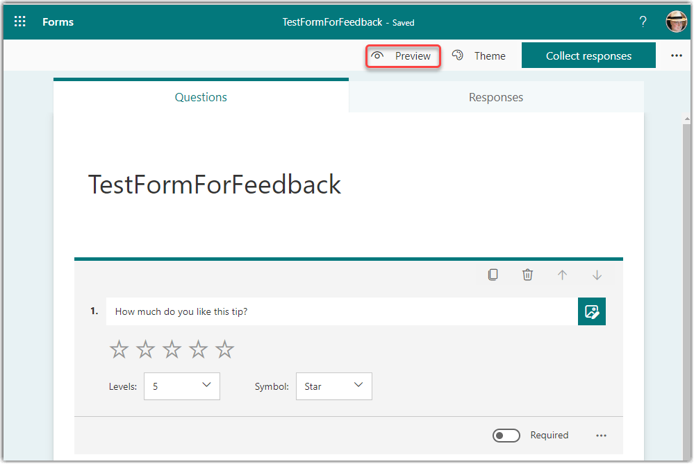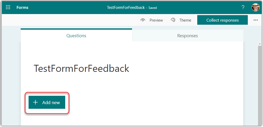 Microsoft Forms will open up with your new Form, and you can add questions as needed by clicking on Add new: