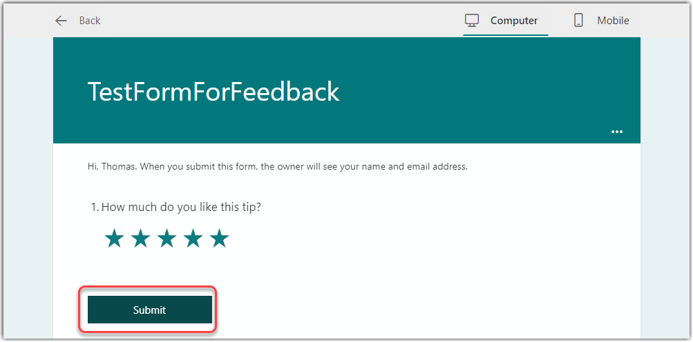 Answer the question(s) on the Form, and click Submit to save the responses: