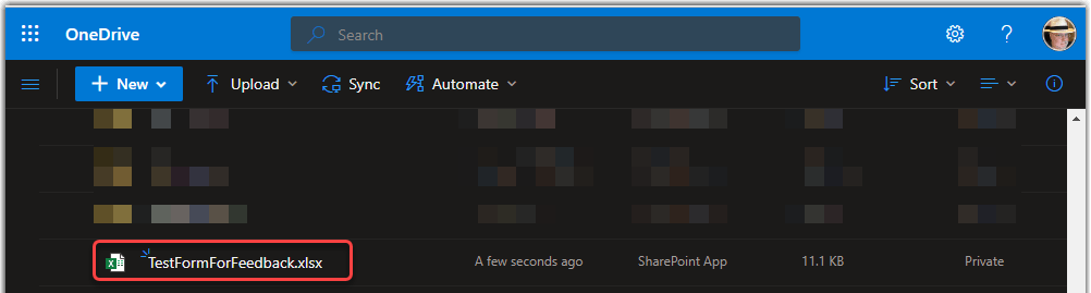 To start, go into your OneDrive and select New > Forms for Excel to create the Forms response spreadsheet: