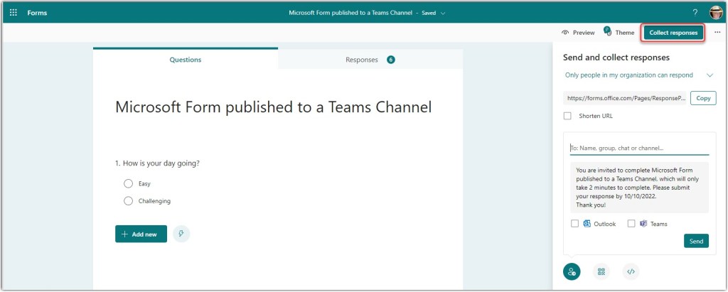 Here I have a simple Microsoft Form, and I’m ready to publish it. To do so, I click on the Collect responses button in the upper-right corner: