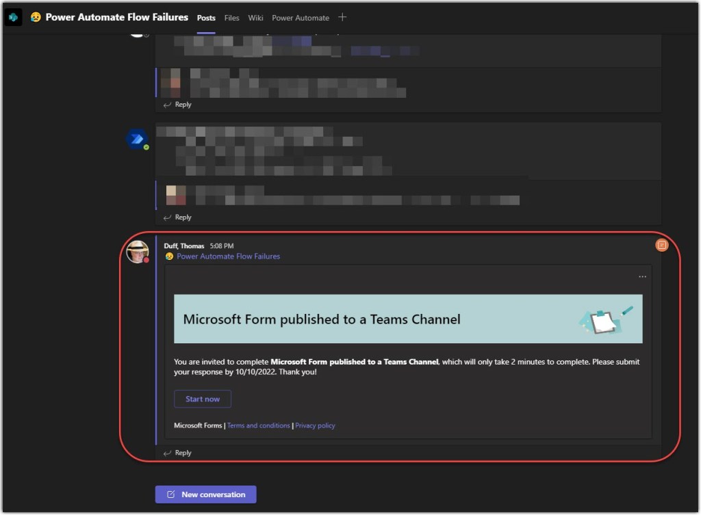 And now if I go into the channel I selected, I’ll see a nicely formatted entry letting people know a Microsoft Form has been published, and they should click on the Start now link to open the form and respond:
