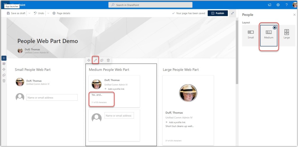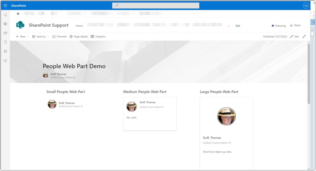 I created a page section with three columns, and put the three different People web part sizes in each column. The Medium setting (the new one) is in the middle. It’s a mix between having no description (the small setting) and having 255 characters of description (the large setting). The medium version allows for just 50 characters, but obviously takes up a lot less space on the page:
