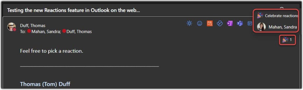 Looking at an email in Outlook on the Web, I now see a smiley face icon that displays the reactions available (thumbs up, love, celebration, laughter, surprise, and sadness). I sent this email off to Sandra: