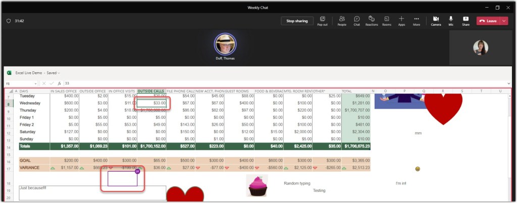 Some thoughts… this is a new feature, so there will likely be some “growing pains” as it gets used more frequently. When we tested during a session, we found out very quickly that Excel Live currently only supports up to 25 people in a meeting. After those 25 people join, others get a message saying they do not have access. Also, much like doing collaborative editing in Excel, two people cannot be updating the same element at the same time. You may see messages saying that your change wasn’t allowed as someone else already edited that area.