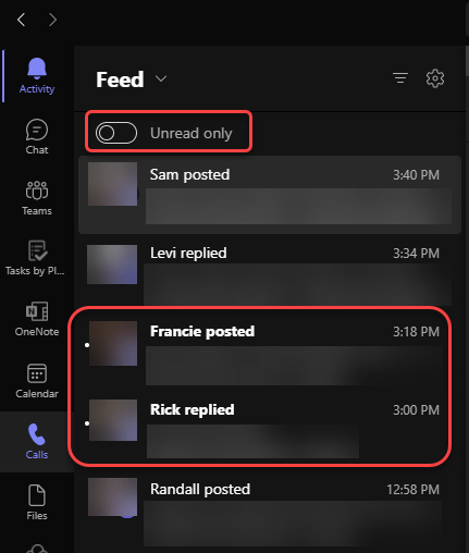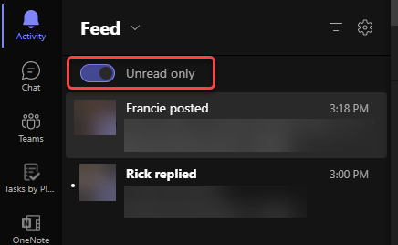 The Activity Feed in Microsoft Teams is a great way to get an overall view of posted items, replies, and various other things that have happened in Teams spaces that you are part of. But… it can be really hard to wade through the mix of things you have and haven’t yet read. There is now an Unread Only toggle in the Activity Feed that will help you focus only on the things that you haven’t yet looked at. Here’s what it looks like…