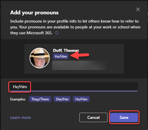 In the Add your pronouns dialog panel, add your desired pronouns and click Save: