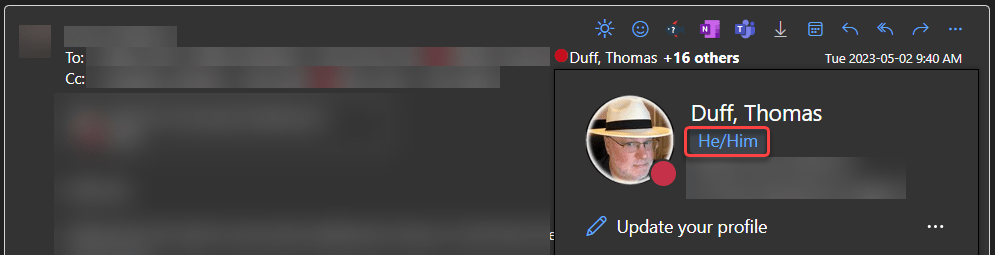 And here’s what it would look like from within Outlook on the web. Please note… the pronoun information will not show up if you’re using the Outlook client: