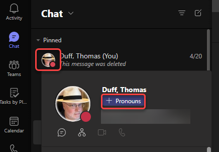 To set your pronouns using Teams, hover over your image (like in Chat). When your profile card pops up, you can click on the + Pronouns link: