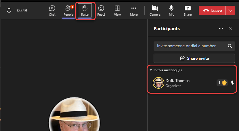 Here’s an example of my hand being raised in a meeting. The microphone is picking up my voice as evidenced by the yellow ring around my picture icon next to my name: