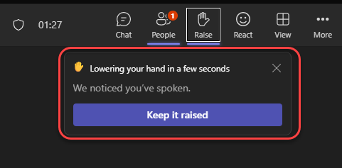 If I don’t take any action, the hand will be automatically lowered after approximately five seconds. If I want to keep my hand raised, I just need to click the Keep it raised button. Please note that if you have noise suppression turned off on your Teams client, this feature will not work for you.