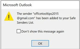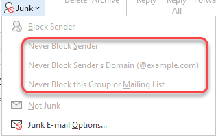 You will see the options to Never Block Sender, Never Block Sender’s Domain, and Never Block this Group or Mailing List (side note: I didn’t have any Junk Email to demo this, so the options are greyed out for me). In this example, imagine I had selected an email from officetooltips2015@gmail.com and selected Never Block Sender:
