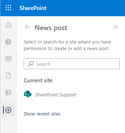 In this example, I clicked on News post, and I have the option to create the post in the Current site or to click on Show recent sites to see other sites I’ve recently visited. Once you click on the location, the new News post is created in the location you selected, and you can start creating your new content right away: